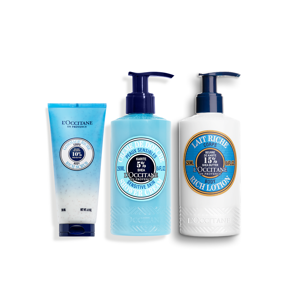A sheavaj ebben a hatékony trióban egyesül, hogy táplálja, védje és nyugtassa a száraz bőrt a testen és a kezeken.
