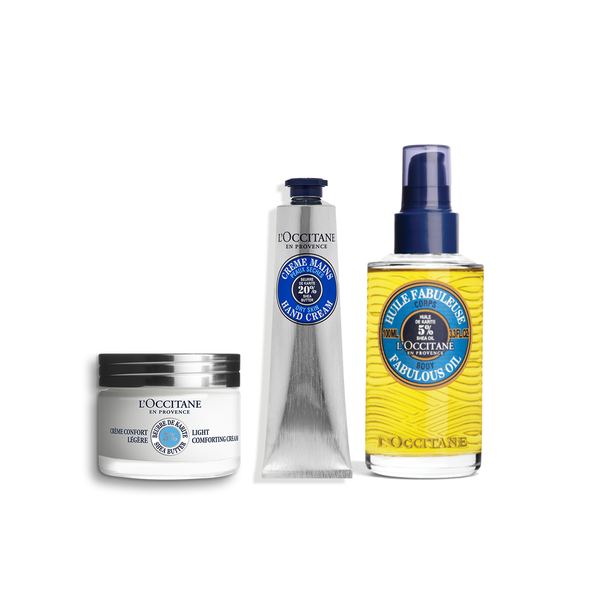 Ez a kivételes összeállítás három alapvető terméket tartalmaz, amelyek a száraz bőrt nyugtatják, így tökéletes mindennapi kényeztető rutint kínálnak.
